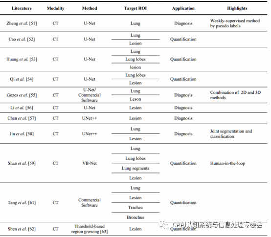 此環(huán)節(jié)的作用在于,對疑似患者肺部區(qū)域拍攝而得到的圖像進行預處理,以提供后續(xù)操作。實施層面,此環(huán)節(jié)包含兩部分工作:肺部區(qū)域劃分和損傷區(qū)域。表1是一些圖像劃分在COVID-19應用中的研究匯總。