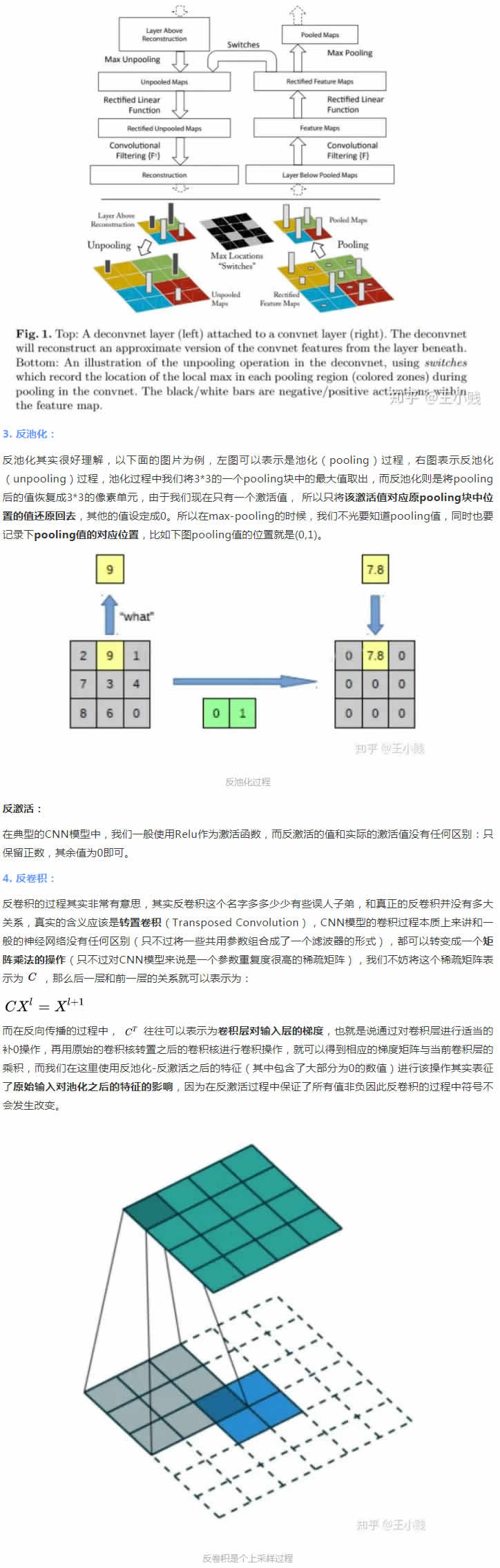 要理解神經(jīng)網(wǎng)絡(luò)中每層都學(xué)到了哪些概念一個非常直觀的方法就是通過對隱層運用一些可視化方法來將其轉(zhuǎn)化成人類可以理解的有實際含義的圖像,這方面一個非常具有代表性的一個工作就是14年ECCV的一篇經(jīng)典之作:《Visualizing and Understanding Convolutional Networks》,這篇文章主要利用了反卷積的相關(guān)思想實現(xiàn)了特征可視化來幫助我們理解CNN的每一層究竟學(xué)到了什么東西。我們都知道典型的CNN模型的一個完整卷積過程是由卷積-激活-池化(pooling)三個步驟組成的。而如果想把一個CNN的中間層轉(zhuǎn)化成原始輸入空間呢?我們就需要經(jīng)過反池化-反激活-反卷積這樣的一個逆過程。整個模型的結(jié)構(gòu)如下圖所示: