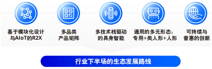 開放性的全棧式智能服務機器人生態(tài)的發(fā)展 路線是一個多維度、跨領域的綜合性戰(zhàn)略, 進入行業(yè)下半場 ,服務機器人正沿著一條創(chuàng) 新的發(fā)展道路前進 。這條道路的實現(xiàn)需要依 靠多種戰(zhàn)略的發(fā)展 ,其中包括了以模塊化設 計和AIoT技術為基礎 ,構建起R2X (Robot-to- Everything),即機器人與萬物互聯(lián),使得機器 人能夠靈活地與周圍環(huán)境和設備進行交互。在 這一生態(tài)中 ,專用、類人形和人形機器人三種 形態(tài)相輔相成 ,不可替代 ,共同構成了機器人 行業(yè)的未來生態(tài) ,以適應各種場景和任務。而 這背后 ,是多技術棧的驅動力 ,它們集成了自 主移動、操作和交互等關鍵技術 ,賦予機器人