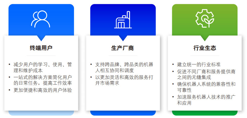 對于廠商來說,開放性的全棧式智能服務(wù)機器人生態(tài)提供了機器人之間的相互協(xié)同和調(diào)度的能力。這種協(xié)同能力使得不同廠商的、不同類 型的機器人可以在同一個環(huán)境中協(xié)同工作,完 成更復(fù)雜的任務(wù)。開放性的全棧式智能服務(wù)機 器人生態(tài)提供了一個平臺,多類型機器人可自 主優(yōu)化作業(yè)路徑、規(guī)避沖突并形成任務(wù)閉環(huán), 顯著提升復(fù)雜場景下的整體服務(wù)效率。使得機 器人能夠作為一個整體系統(tǒng)協(xié)同工作,提供更 加靈活和高效的服務(wù)。對廠商而言,這種生態(tài) 化協(xié)作將推動行業(yè)從單一產(chǎn)品競爭轉(zhuǎn)向多品類 產(chǎn)品矩陣的生態(tài)建設(shè)。