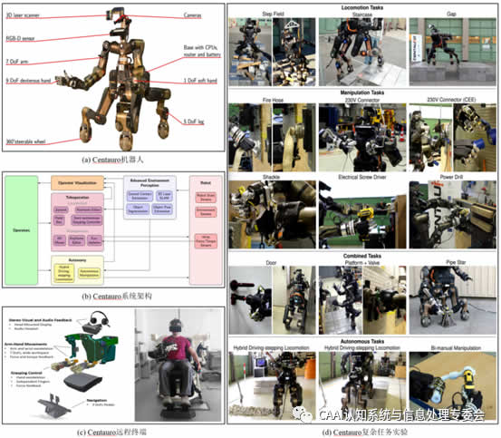 Centauro[11]是德國伯恩大學計算機學院研制的遙操作輪腿復合的移動操作機器人(如圖5(a)(b))。Centauro整體采用與半人馬相似的構型,頭部配備一個3維激光雷達,實現(xiàn)對環(huán)境的三維建zhon圖和感知;頭部下端四周配置3個廣角相機用于實時監(jiān)控各部分的運動狀態(tài);頸部配備一臺kinect相機用于對抓取目標物體的識別和姿態(tài)估計;肩部配備兩個七自由度的機械臂和9自由度的機械手,可以完全模仿人體手臂的全部運動,機械手腕部配備扭力傳感器和手部配備壓力傳感器,用于操作端的力反饋;行走機構由四個5自由的機械腿構成,可完成人體腿部運動的模仿,每個腿部具有獨立驅(qū)動的主動輪,可實現(xiàn)平整路面快速移動和復雜路面的步態(tài)運動,腿部運動由基座的兩個RGB相機實時監(jiān)控;控制單元由三個PC構成,分別負責基礎系統(tǒng)控制,視覺感知處理和G級功能控制(多傳感器數(shù)據(jù)融合)。操作者可通過遠程操作平臺(如圖5(c))實時操作Cantauro完成各種復雜操作任務,通過簡單設置,Centauro通過融合自身攜帶的多傳感器信息可實現(xiàn)自主移動和抓取操作。Tobias Klamt[12]測試了Centauro在多種操作任務中的系統(tǒng)穩(wěn)定性(如圖5(d))。