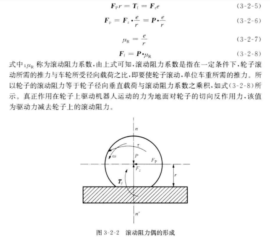 如果將法向反作用力F. 向后平移至通過輪子中心,與其垂線重合,則輪子在 地面上滾動時的受力情況如圖3-2-2所示,出現(xiàn)一個附加的力偶矩T=F,e, 這個 阻礙車輪滾動的力偶矩稱為滾動阻力偶矩。由圖3-2-2可知,欲使輪子在地面上 保持勻速滾動,需要在輪軸上加一驅(qū)動力矩r 或是加一推力Fp, 從而克服上述滾 動阻力偶矩。相關(guān)數(shù)學關(guān)系如下所示。