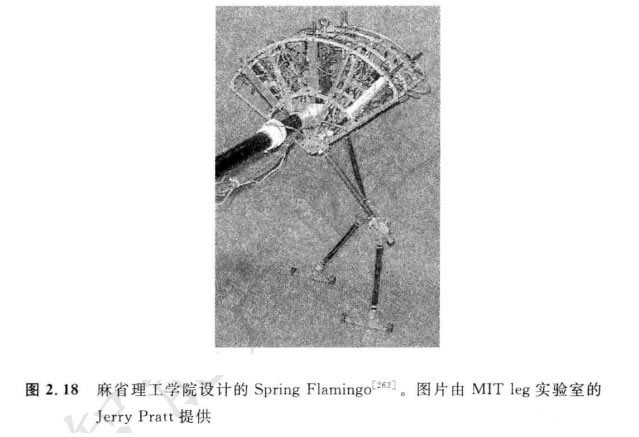 雙腳機(jī)器人只能在某些限制內(nèi)靜態(tài)地穩(wěn)定。因此,像P2 和WABIAN-2R 這樣的 機(jī)器人即使站著不動(dòng),通常也需要連續(xù)地進(jìn)行伺服平衡校正。而且,各條腿都需要有足 夠的容量以支撐機(jī)器人全部重量。在四腿機(jī)器人情況下,平衡問題隨各條腿上的負(fù)荷 需求而變得容易解決。雙腿機(jī)器人的 一個(gè) 出色設(shè)計(jì)是麻省理工學(xué)院設(shè)計(jì)的Spring Fla- mingo (圖2. 18)。這個(gè)機(jī)器人與腿激勵(lì)器相連,插入了彈簧,實(shí)現(xiàn)更有彈性的步態(tài)。通過與限制膝蓋關(guān)節(jié)角度的“膝蓋骨”相結(jié)合,F(xiàn)lamingo 實(shí)現(xiàn)了驚人的仿生運(yùn)動(dòng)。