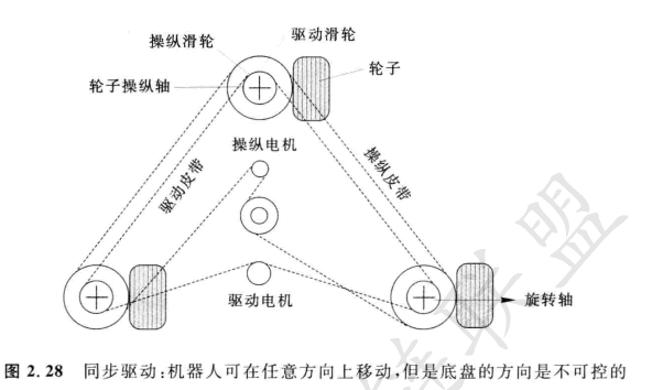 在室內(nèi)移動機器人應(yīng)用中,同步驅(qū)動結(jié)構(gòu)(圖2.28)是一種流行的輪子裝配,也是 一個令人很感興趣的結(jié)構(gòu)。因為它雖然有3個驅(qū)動和操縱輪,可是總共只用了2個電機。一個平移電機設(shè)置3個輪子一起的速度; 一個操縱電機,使所有輪子繞著它們 各自的垂直操縱軸一起旋轉(zhuǎn)。但要注意的是,輪子是相對于機器人的底盤受操縱的, 所以,沒有直接方法重新設(shè)定機器人底盤的方向。實際上,由于凹凸不平輪胎的滑動,在整個時間里底盤方向一定會漂移,造成旋轉(zhuǎn)的航位測定誤差。