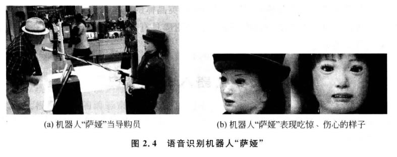 日本著名的東京高島屋商場為了解決顧客排長隊購物難的問題,引入了一款語音識 別機器人“薩婭”當導購員,如圖2.4所示!八_婭”能夠用超過700種不同的語音方式對 購物者的問題和投訴做出反應,它會告訴顧客去哪層樓能夠買到他們所需的商品,還能 和他們閑聊幾句,但是有時也會無法“溝通”。曾有一位記者問“薩婭”問題,可能是因為 他口音太重,“薩婭”聽不懂,一直指著洗手間的方向,無法告訴記者所要去的商場樓層。 雖然“薩婭”的面部動作還存在一些不足,但是它表現(xiàn)高興、傷心或生氣時是很逼真的。 盡管“薩婭”是一個語音識別服務機器人,但是它像其他日本人那樣講禮貌,彬彬有禮。