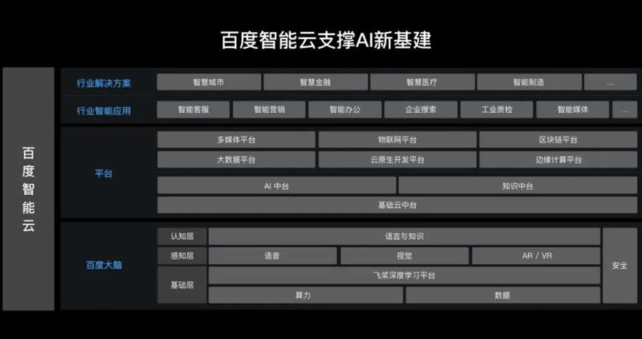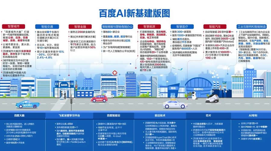 6月11日,百度發(fā)布AI新基建版圖,目標成為中國新基建AI服務大提供商。依托百度大腦、飛槳深度學習平臺、百度智能云、芯片、量脈、超級鏈等在內的新型AI基礎設施,百度在智慧城市、智能交通、智慧金融、智能客服與營銷、智慧能源、智慧醫(yī)療、智能汽車、工業(yè)互聯(lián)網和智能制造等八大L域推動產業(yè)智能化升級。