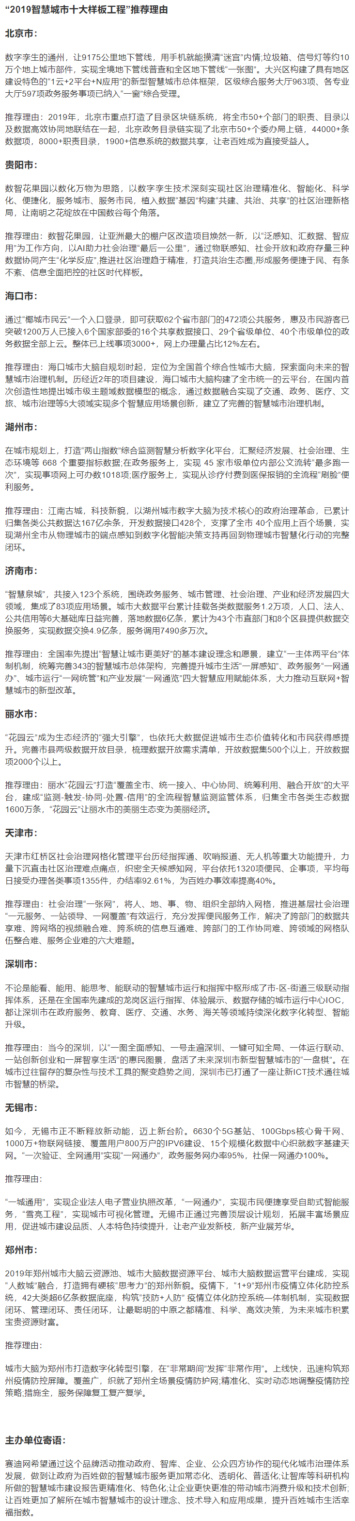 終北京市、貴陽(yáng)市、?谑小⒑菔、濟(jì)南市、麗水市、天津市、深圳市、無(wú)錫市、鄭州市十座城市,以優(yōu)秀的城市建設(shè)經(jīng)驗(yàn)、切實(shí)的城市運(yùn)營(yíng)數(shù)據(jù)和G口碑的市民反饋,被評(píng)為“2019智慧城市十大樣板工程”。