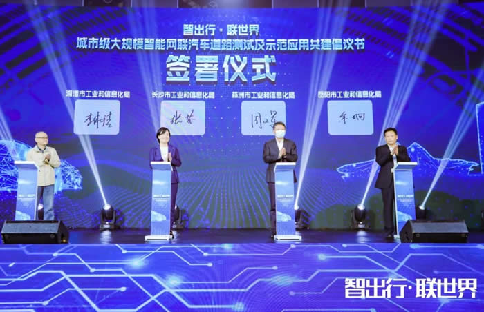 長沙市、株洲市、湘潭市、岳陽市工業(yè)和信息化局共同簽署了《城市級(jí)大規(guī)模智能網(wǎng)聯(lián)汽車道路測(cè)試及示范應(yīng)用共建倡議書》。
