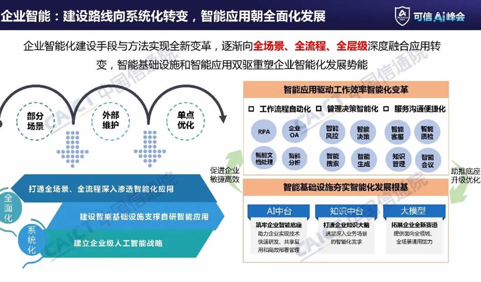 企業(yè)智能化建設(shè)手段與方法實(shí)現(xiàn)全新變革,逐漸向全場(chǎng)景、全流程、全層級(jí)深度融合應(yīng)用轉(zhuǎn)變。隨著智能化技術(shù)的不斷發(fā)展和應(yīng)用深入,企業(yè)智能建設(shè)從部分場(chǎng)景、外部維護(hù)、單點(diǎn)優(yōu)化逐漸向系統(tǒng)化、多面化轉(zhuǎn)變,通過(guò)智能基礎(chǔ)設(shè)施和智能應(yīng)用雙驅(qū)重塑企業(yè)智能化發(fā)展勢(shì)能。