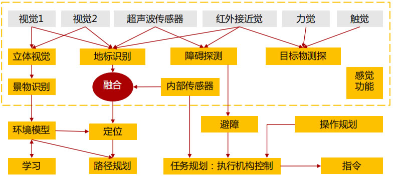 視覺(jué)感知控制基于2D,3D攝像頭信息采集實(shí)現(xiàn)目標(biāo)感知;多模態(tài)融合控制進(jìn)行感知模態(tài)信息融合進(jìn)行運(yùn)動(dòng)預(yù)測(cè)與意圖識(shí)別